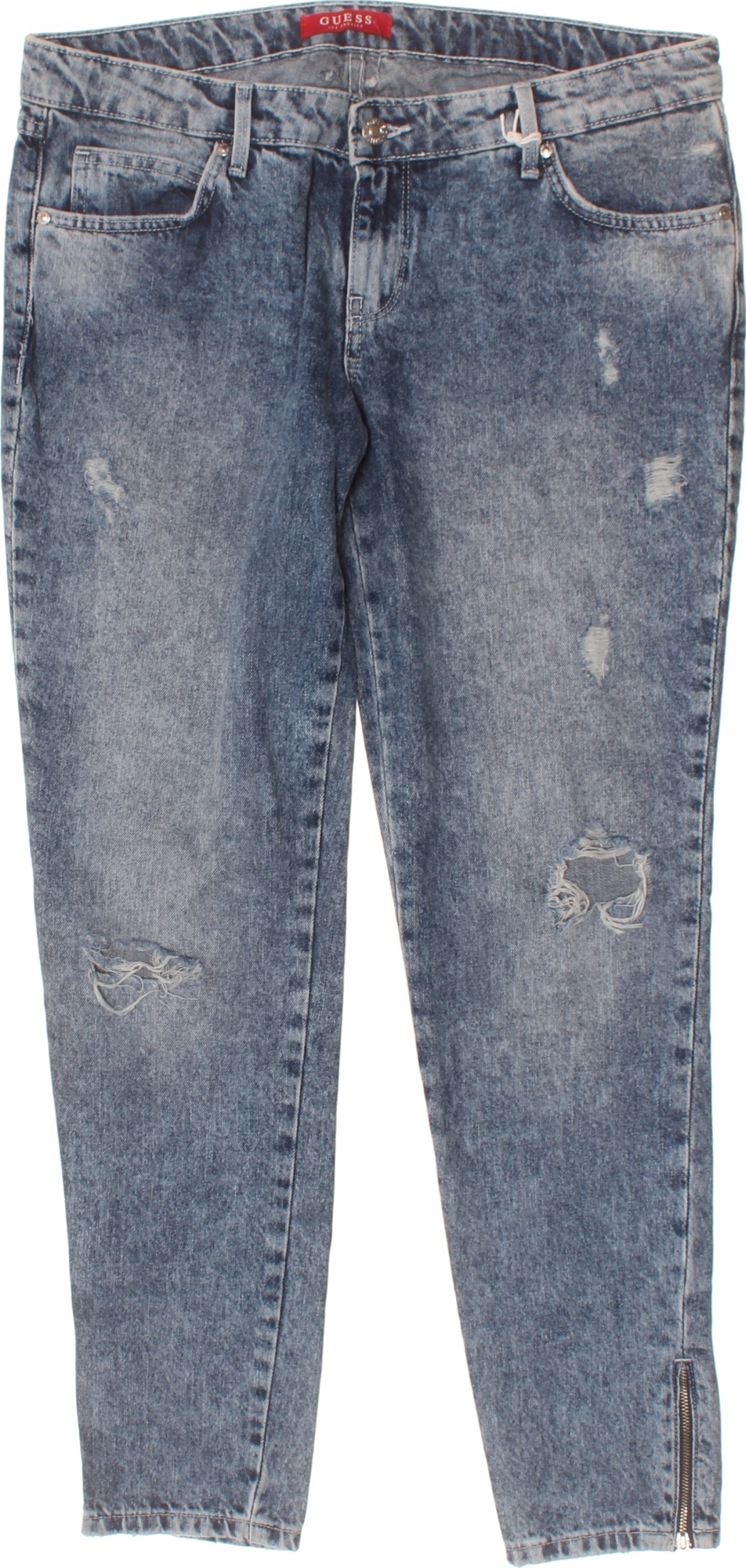 Guess Dámské bavlněné modré džíny boyfriend se zipy seprané s dírami Velikost 30