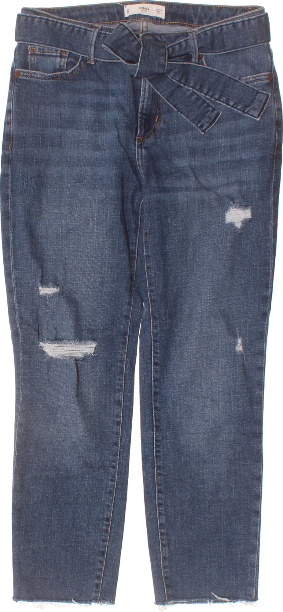 MANGO Dámské modré rifle s vázáním v pase a roztřepenými nohavicemi Velikost 36