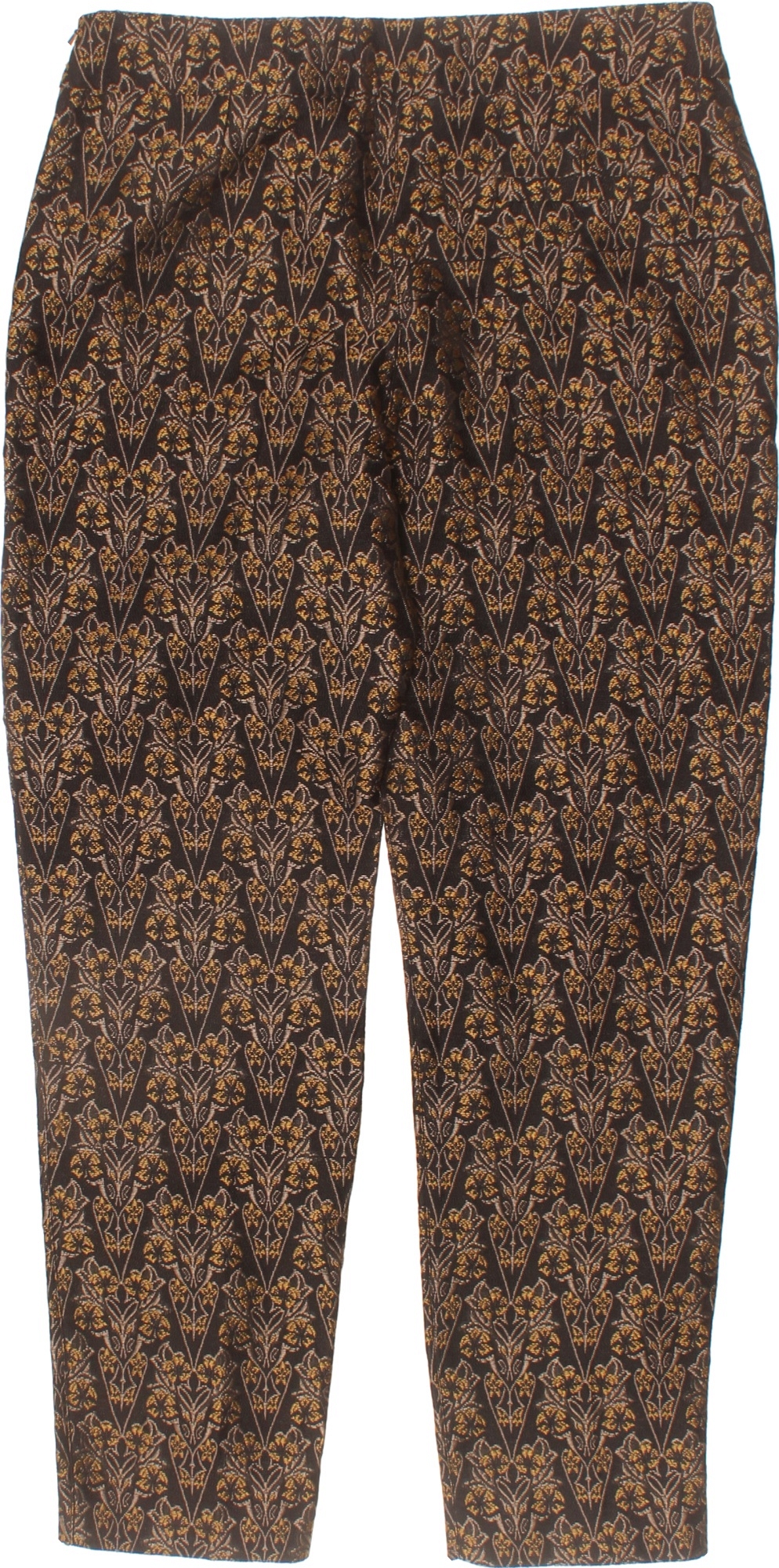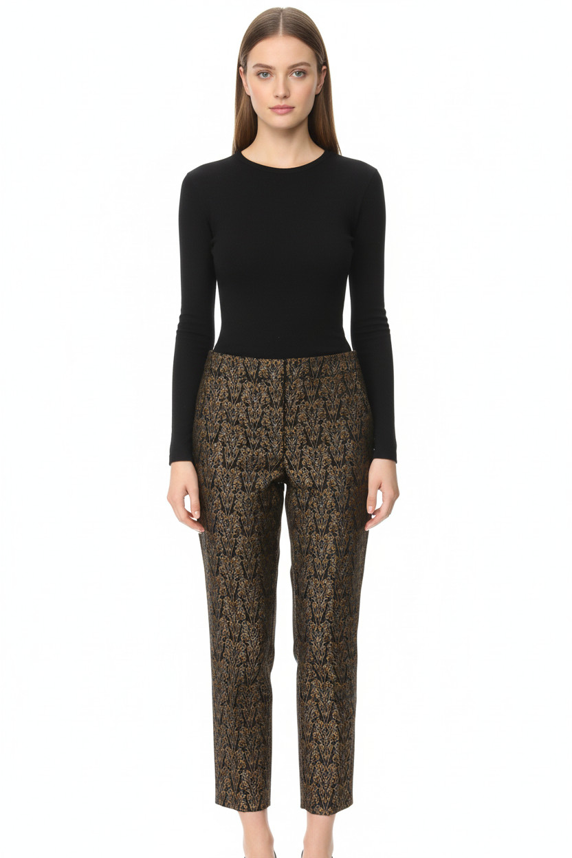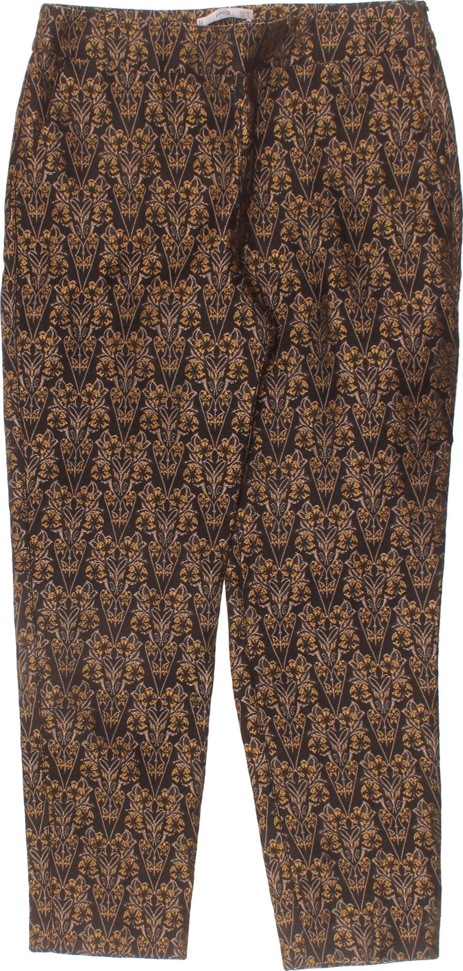 MANGO Dámské elegantní polyesterové kalhoty černé zlaté brokát vzor rovné ležérní Vel. S
