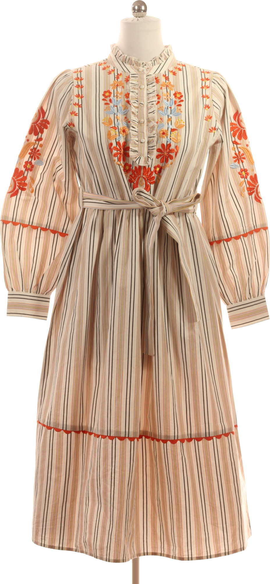 RICH&ROYAL Dámské midi šaty s dlouhým rukávem béžové proužkované boho s páskem vyšívané Velikost 38