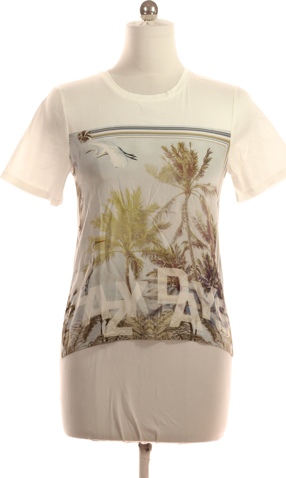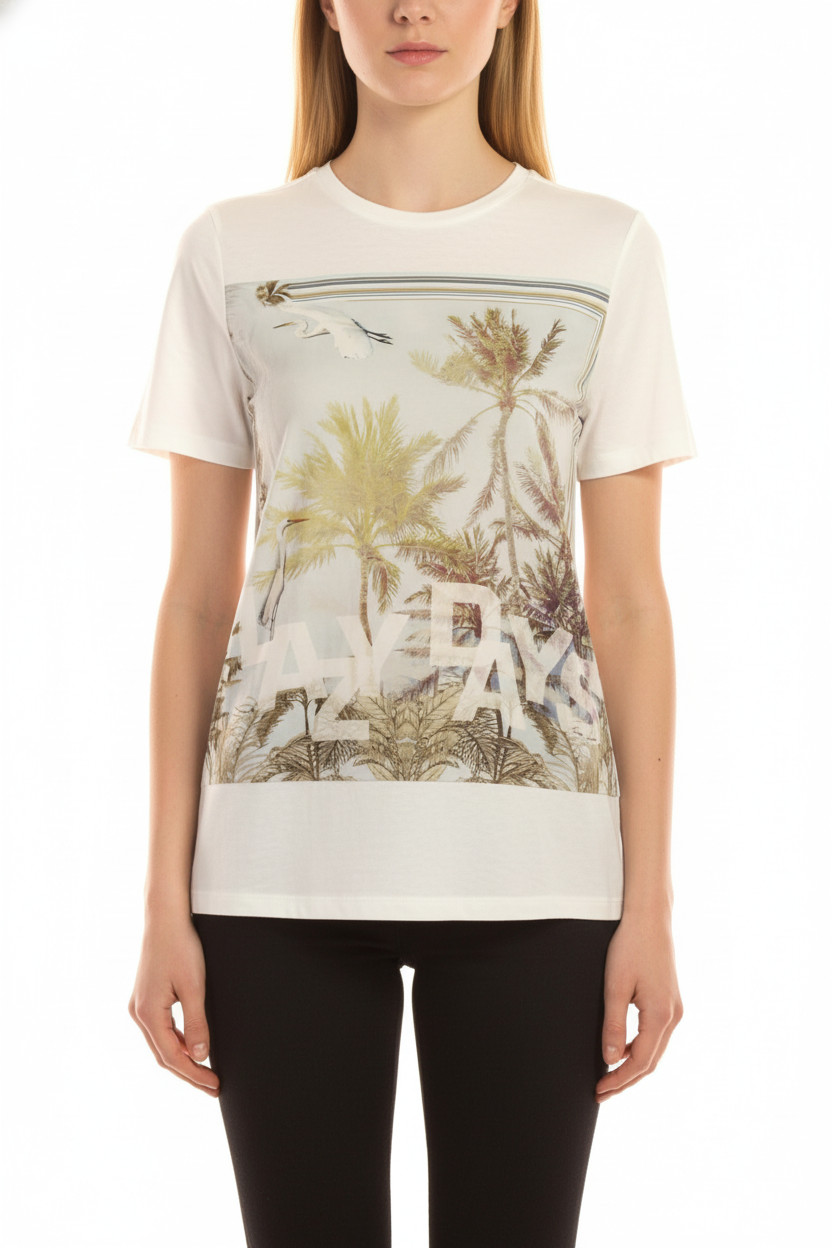 MARCCAIN Dámské tričko s krátkým rukávem a potiskem palem a nápisem Velikost S