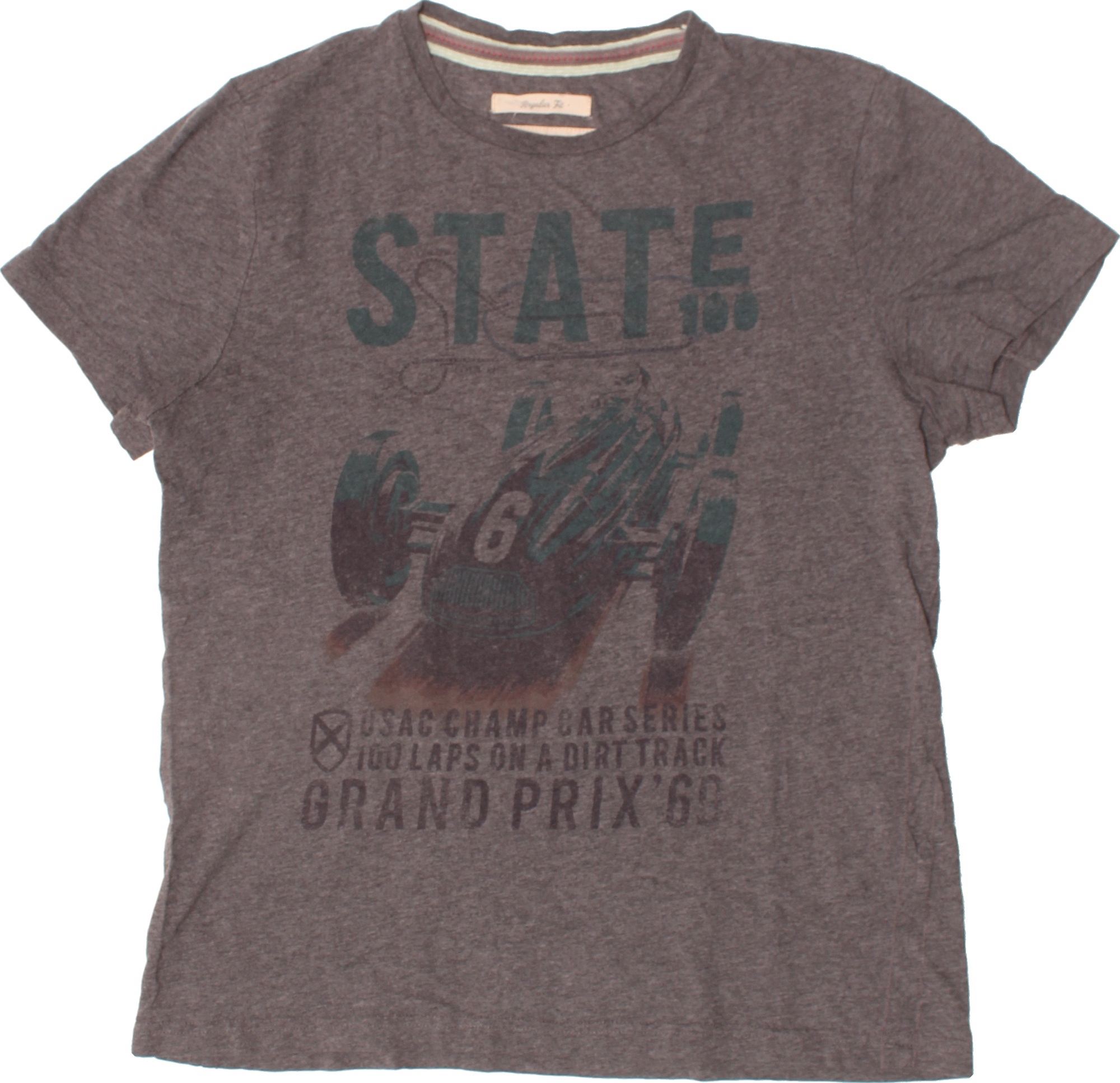 TIMEOUT BRAND Pánské tričko hnědé s kulatým výstřihem a retro závodním potiskem Vel. m