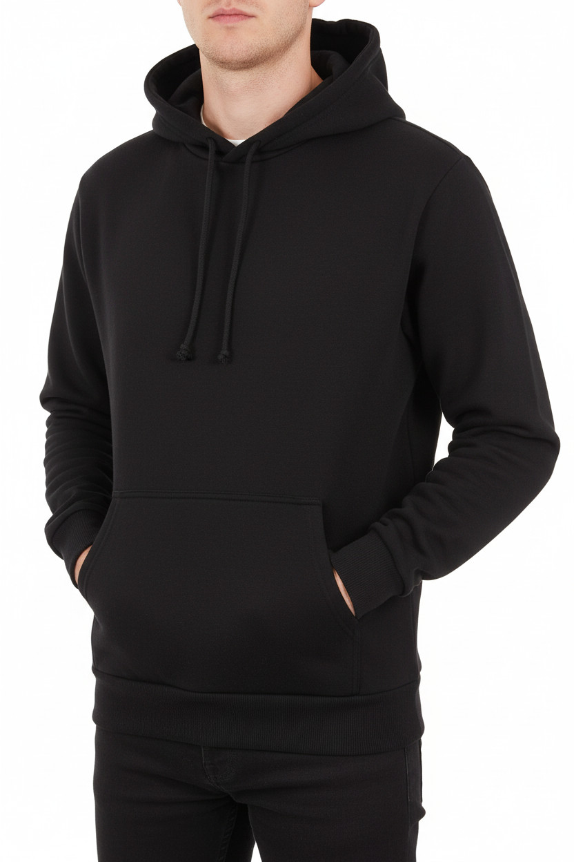 HM Pánská černá mikina s kapucí přes hlavu klokaní kapsou jednobarevná Velikost S